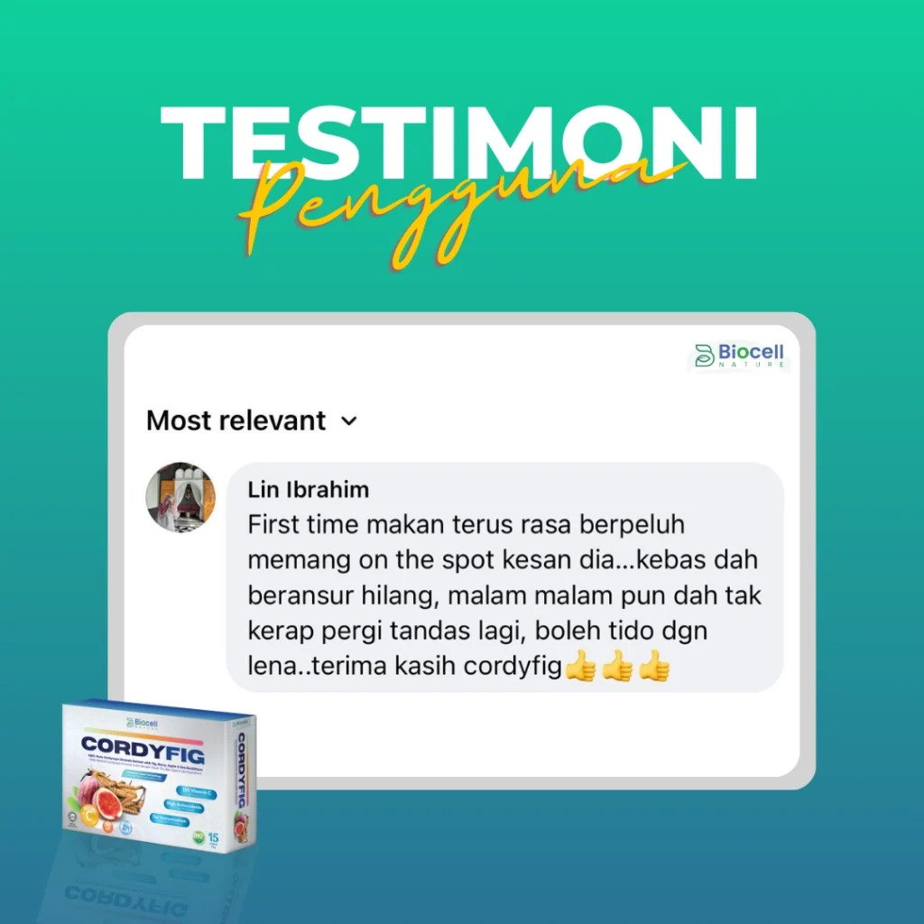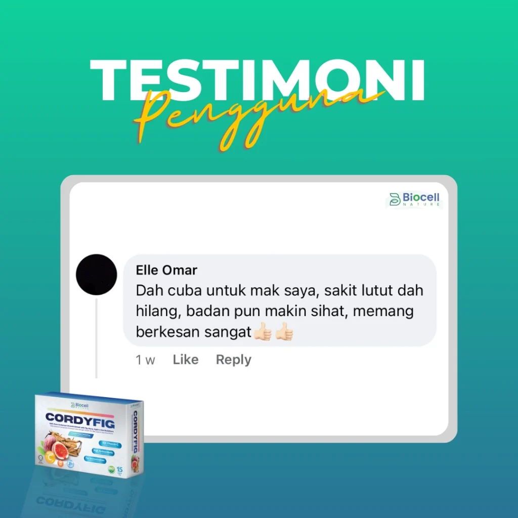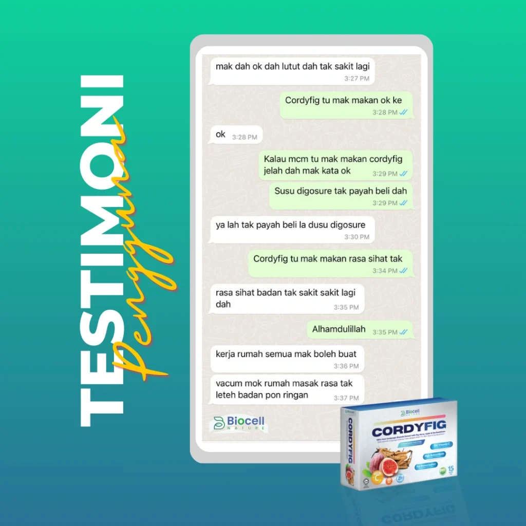 “Dah setahun duduk atas kerusi roda, selepas amalkan 2 kotak Cordyfig, Tak sangka dah boleh jalan semula”
