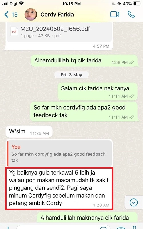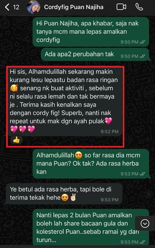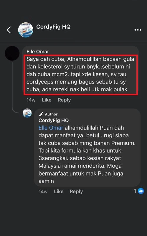 “Lepas amalkan cordyfig, Doktor pun terkejut tengok kencing manis dah turun ke paras normal, badan pun rasa sihat dan bertenaga”